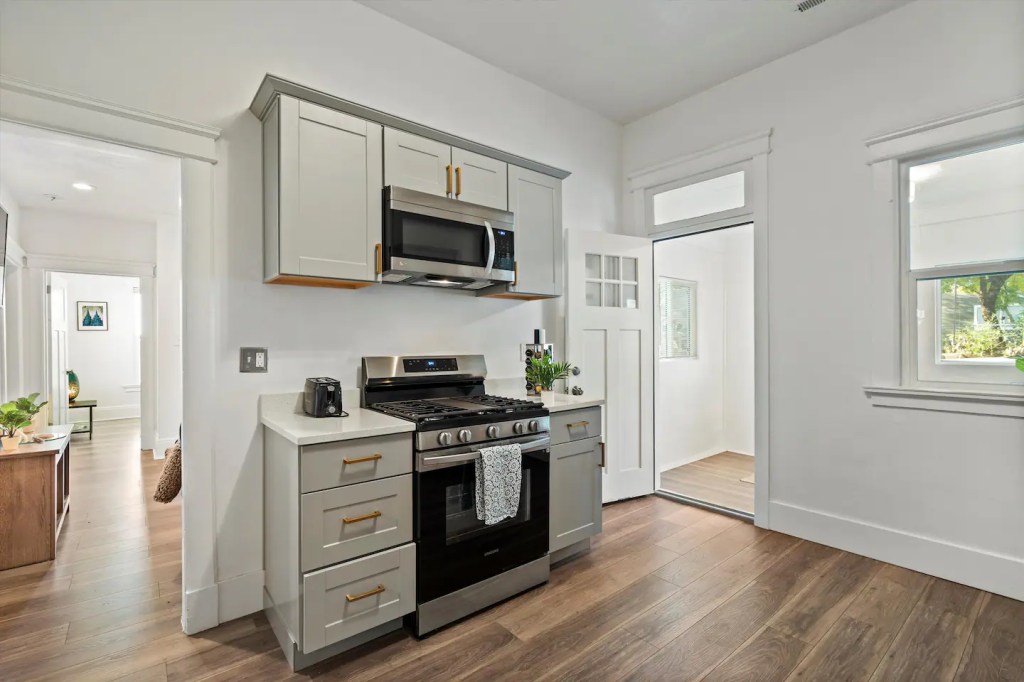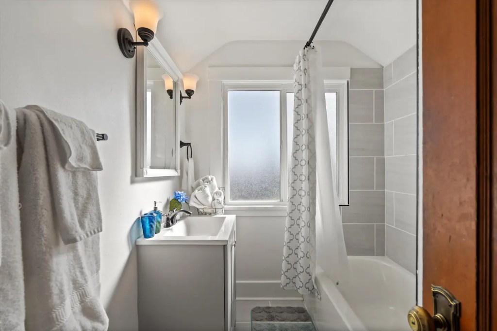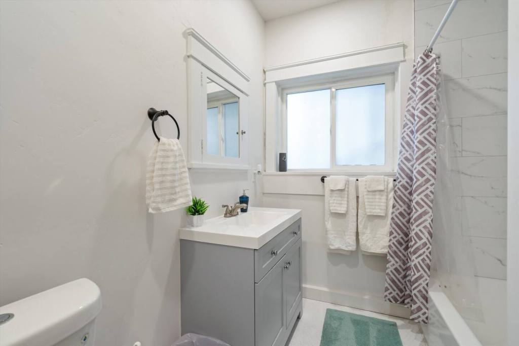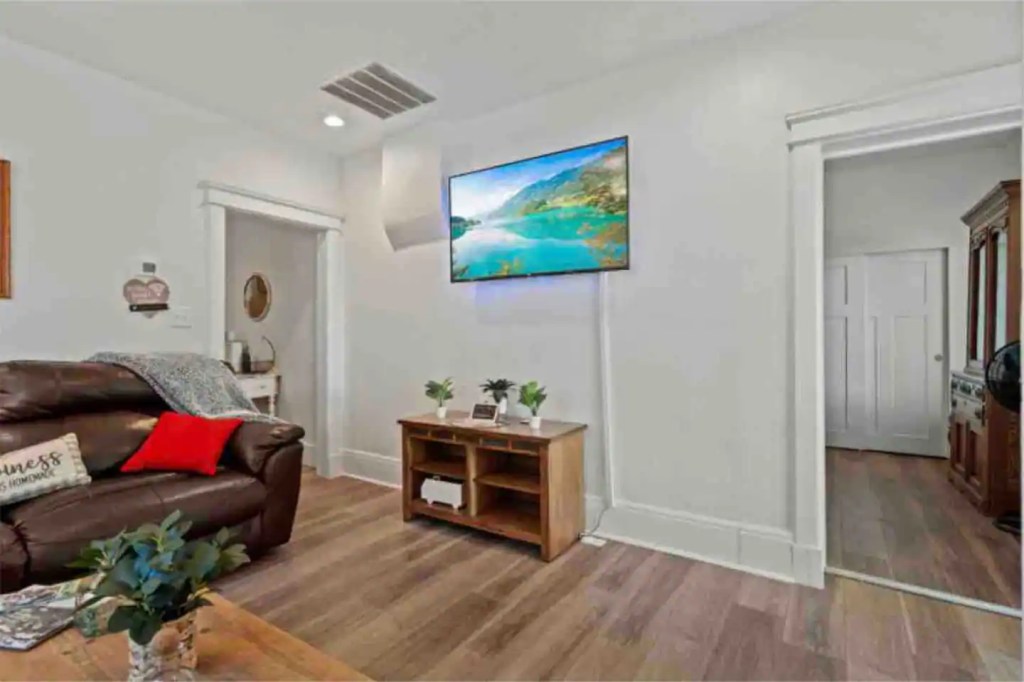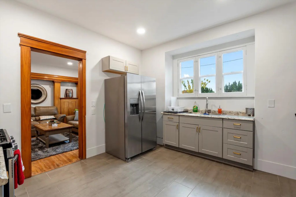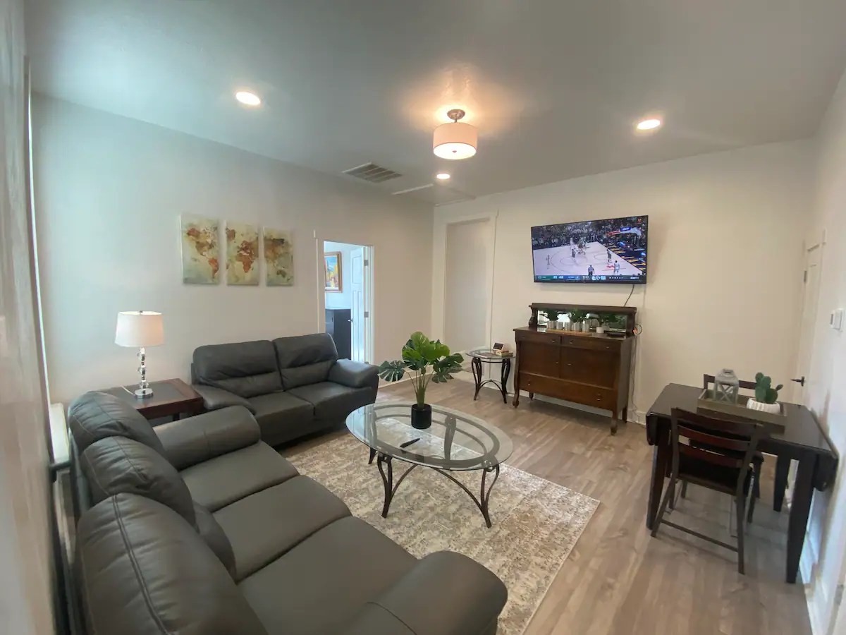 The ‘Loft’ is located of course, upstairs. It is very private! You’ll enter a cute, updated kitchen with stainless steel appliances and quartz countertops. You’ll then walk into a spacious family room with a jumbo sized leather couch and 55” flat screen TV. Get a great nights sleep on this comfy queen sized sleigh bed. A brand new remodeled bathroom with bathtub and shower. We know you’ll love it here!