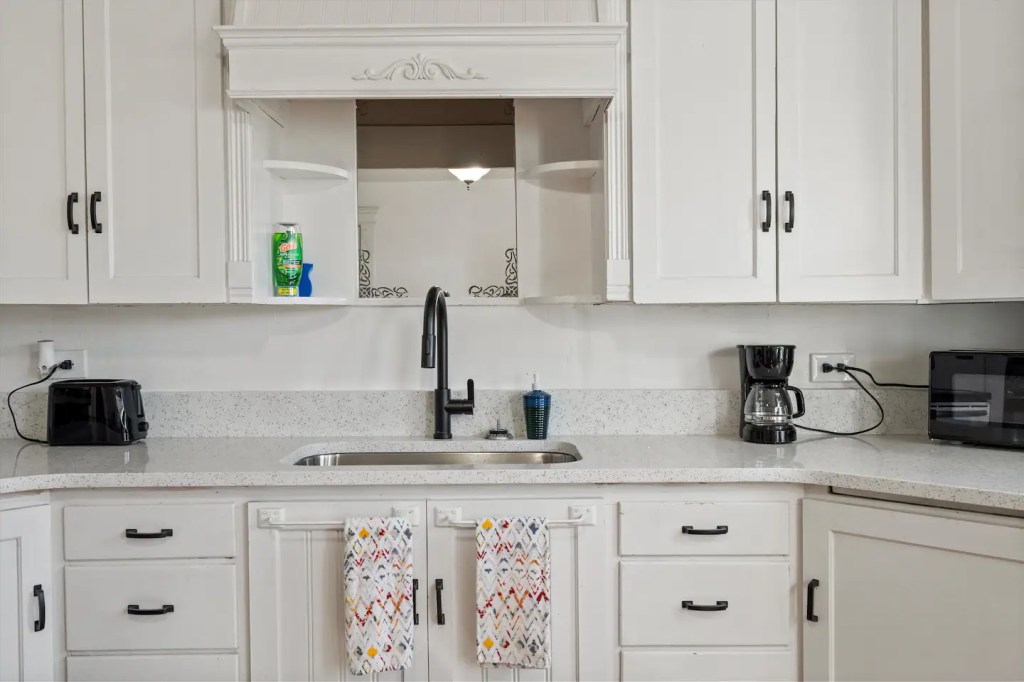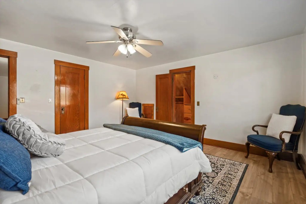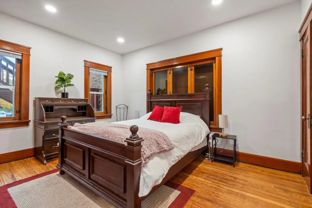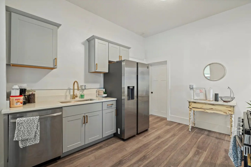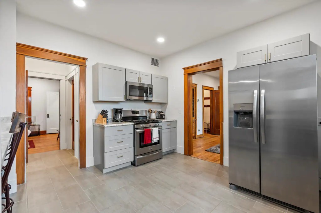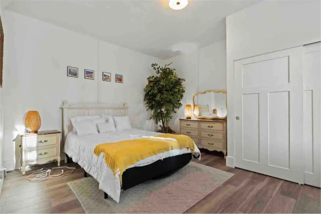 The ‘Loft’ is located of course, upstairs. It is very private! You’ll enter a cute, updated kitchen with stainless steel appliances and quartz countertops. You’ll then walk into a spacious family room with a jumbo sized leather couch and 55” flat screen TV. Get a great nights sleep on this comfy queen sized sleigh bed. A brand new remodeled bathroom with bathtub and shower. We know you’ll love it here!