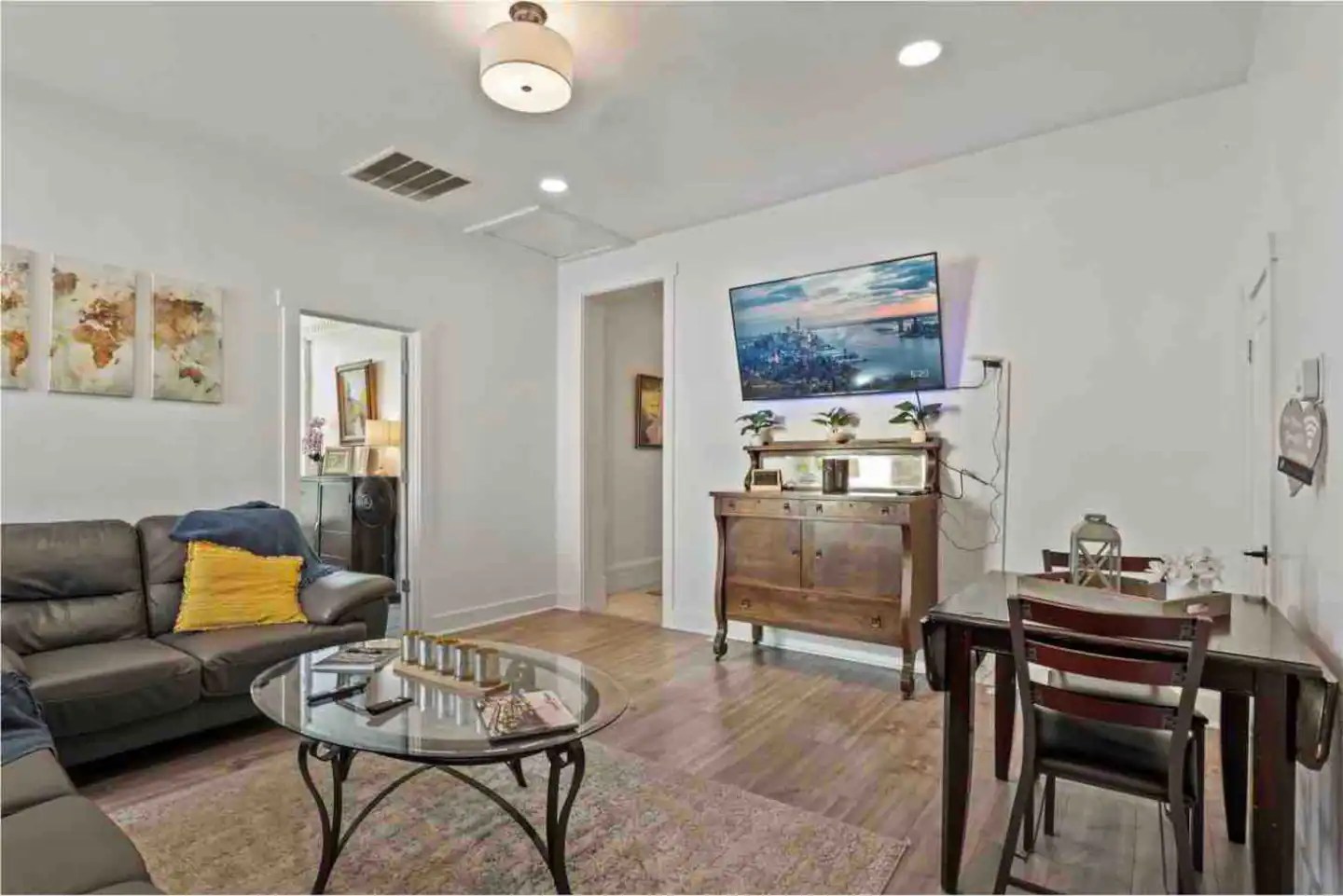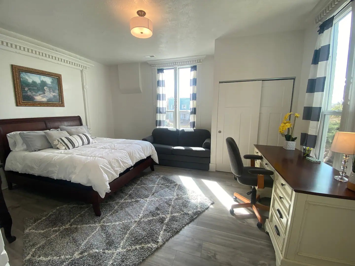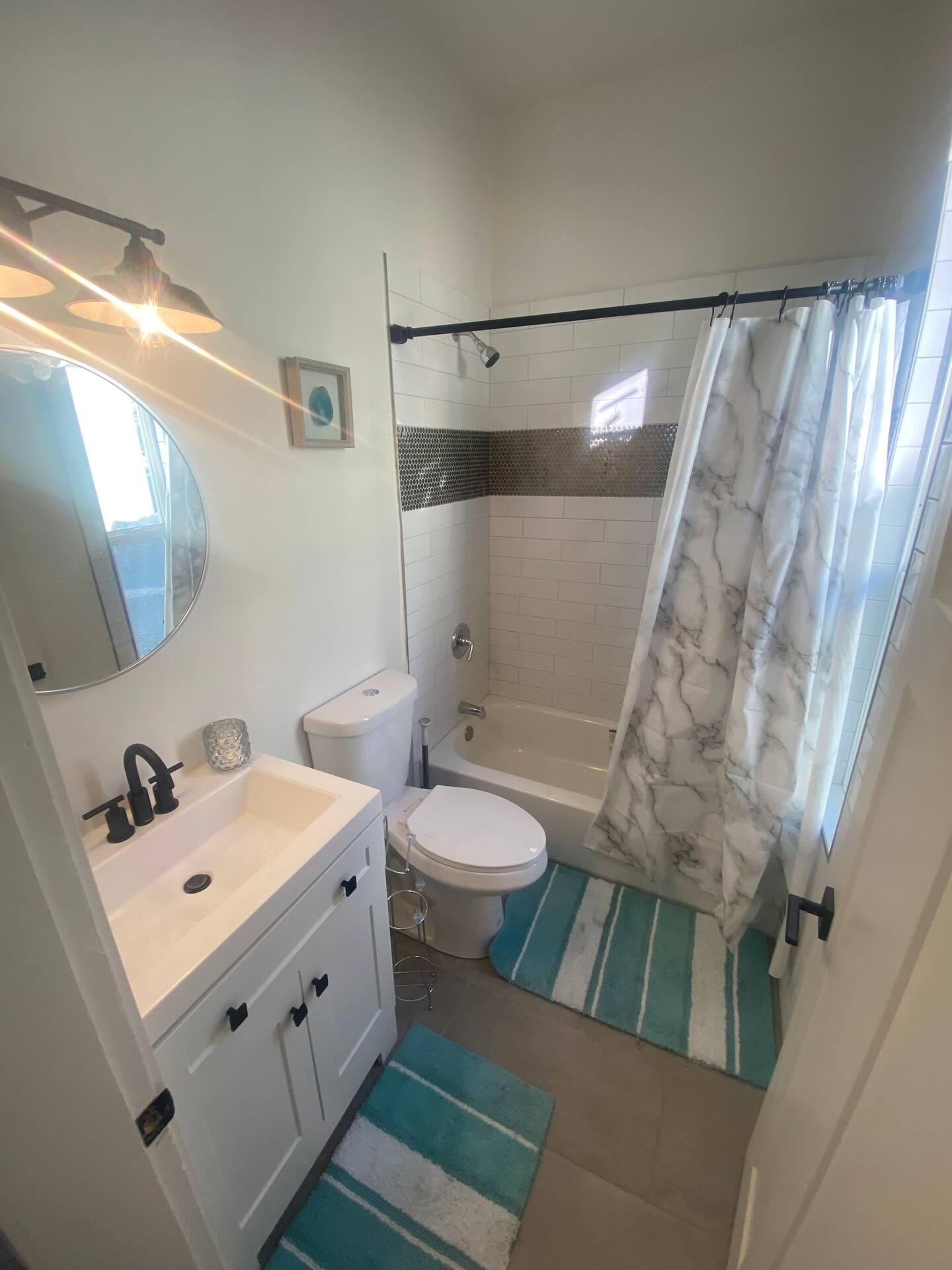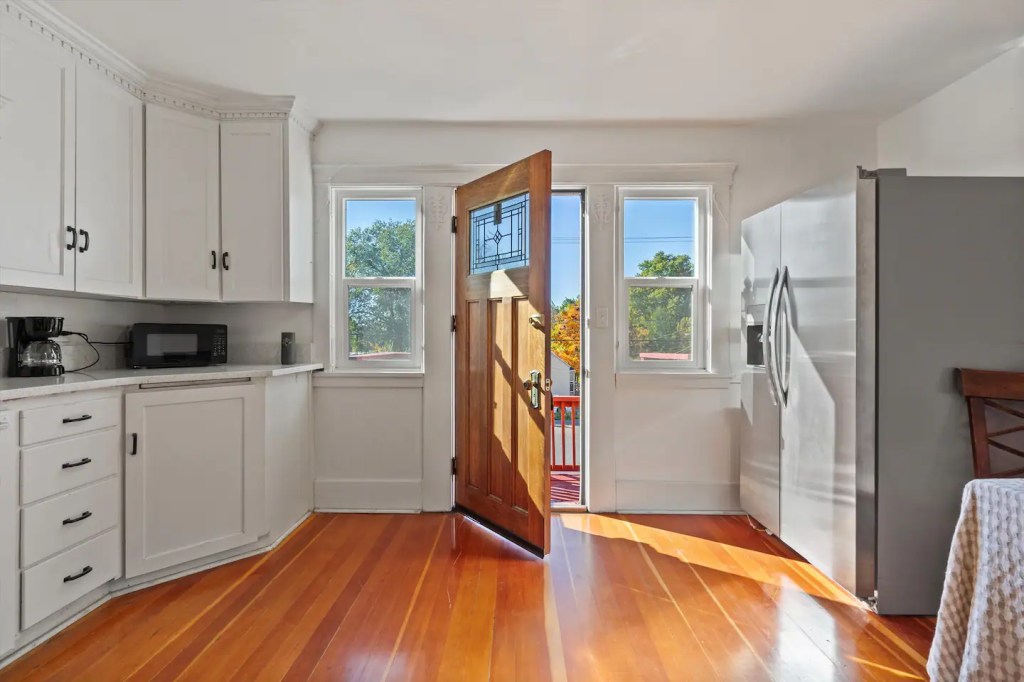 The ‘Loft’ is located of course, upstairs. It is very private! You’ll enter a cute, updated kitchen with stainless steel appliances and quartz countertops. You’ll then walk into a spacious family room with a jumbo sized leather couch and 55” flat screen TV. Get a great nights sleep on this comfy queen sized sleigh bed. A brand new remodeled bathroom with bathtub and shower. We know you’ll love it here!